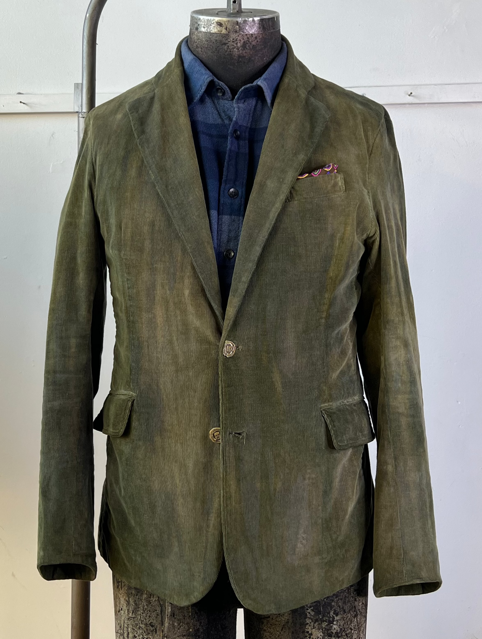 Provenance: Men's Hand Dyed Olive Corduroy Single Breasted Blazer, Flap Pockets, No Vent.
