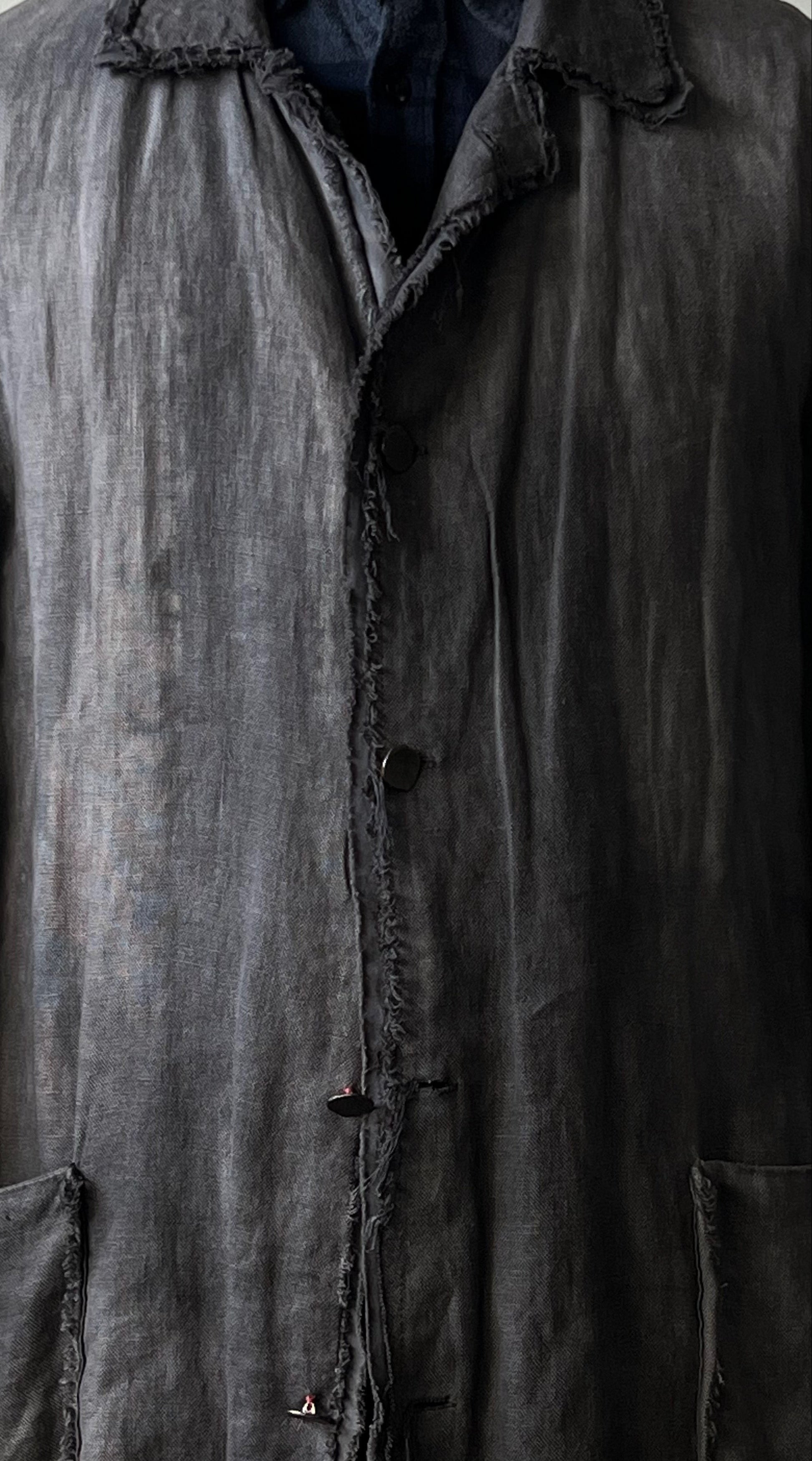 Provenance: Unisex Hand Dyed Charcoal Linen Raw Edge Coat w/ Patch Pockets.